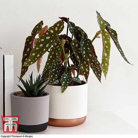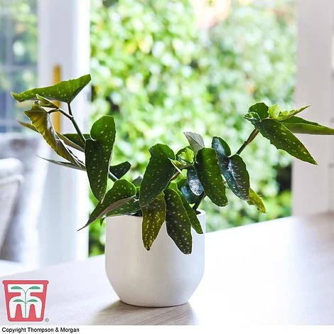 This tropical beauty always attracts comment. Who could resist the asymmetrical, heart shaped, silver-spotted foliage with dark claret undersides? The large leaves of Begonia maculata are borne upon upright stems. In summer, pendulous clusters of white or pale pink flowers appear making an attractive display. This tender perennial makes a fine specimen plant for a warm bright position, well away from the scorch of direct sunlight. Perfect for add a lush jungle feel to the conservatory! Height: 100cm (39″). Spread: 50cm (20″).