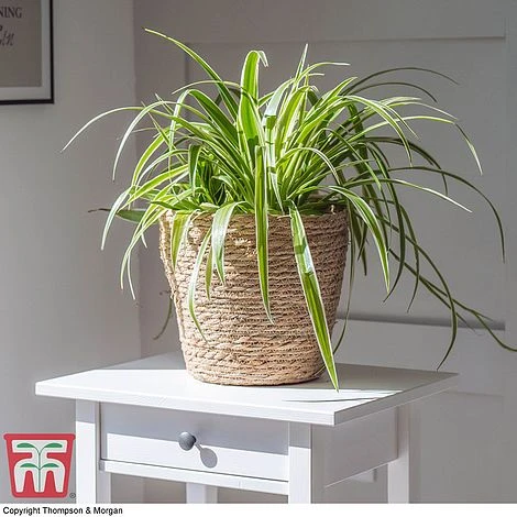 Perfect for beginners! The Spider plant is one of the most commonly found house plants, not least because it is so easy to grow. The brightly variegated, strap-like foliage arches beautifully to create a lovely tumbling effect. As it grows, Chlorophytum comosum ‘Variegatum’ produces long, cascading stems with new baby plants at their tips, which dangle beneath the parent plant. With maturity, upward-facing stems of white star-shaped flowers are also produced. Perfect for a hanging basket or shelf where its stems can hang freely. Height and spread: 50cm (20″).