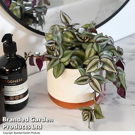 Tradescantia zebrina is a particularly eye-catching house plant. The trailing stems are covered with extraordinary silver-striped leaves, each with a shocking-pink underside. This cheery little plant will happily spill over the sides of its pot to create a cascade of colour. If that’s not enough, then it will also produce pretty purple-pink flowers sporadically throughout the year, which always come as a lovely surprise. Reliable and easy to grow, this Silver Inch Plant makes a great choice for an indoor hanging basket. Height and spread: 40cm (16″).